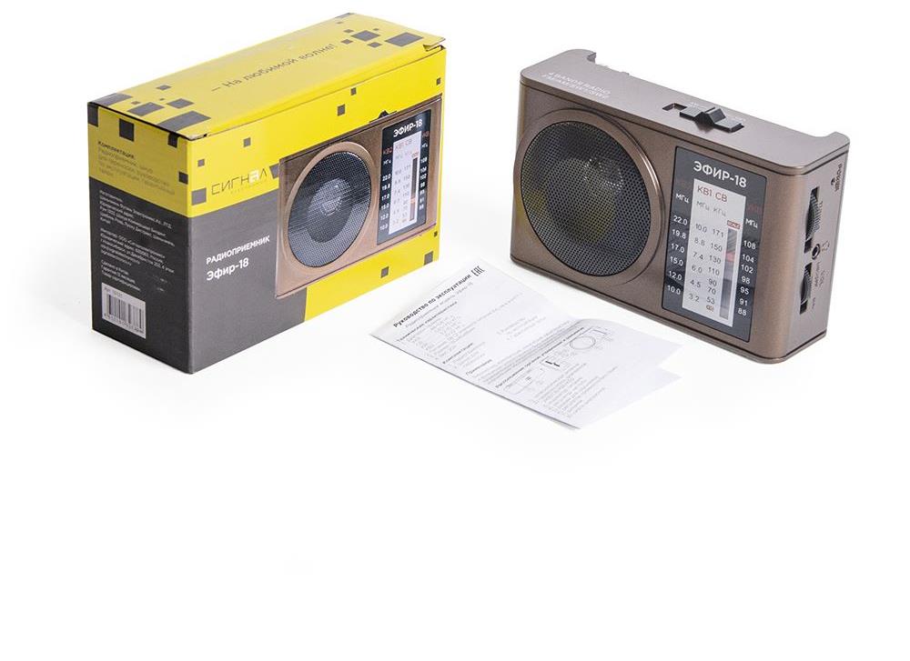 Радиоприемник ЭФИР 18 – это ваш верный спутник для прослушивания любимых радиостанций. Эта модель имеет привлекательный внешний вид и приятный коричневый цвет (таких в линейке ЭФИР еще не было!). Радиоприемник компактный - 130*45*85мм, а это значит, что его удобно брать с собой и использовать за пределами дома. У радио аналоговый тип тюнера, что позволяет точно настроить волну радиостанции. Он принимает СИГНАЛ в диапазонах УКВ/СВ/КВ1/КВ2, с частотой УКВ (88-108МГц), СВ (530-1710КГц), КВ1 (3,2-10МГц), КВ2 (10-22МГц). Работает ЭФИР-18 от 2 батареек АА. Товар сертифицирован, гарантия 12 месяцев.