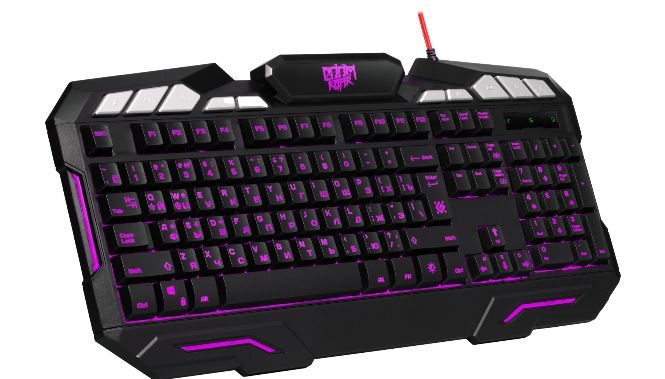 Клавиатура геймерская, проводная, интерфейс USB, специальные игровые функции: блокировка системных клавиш Windows и переключение стрелок курсора на кнопки WASD*, 3 цвета подсветки, клавиши быстрого доступа, регулируемая яркость и частота опроса, металлическое дно, ферритовый фильтр помех.
