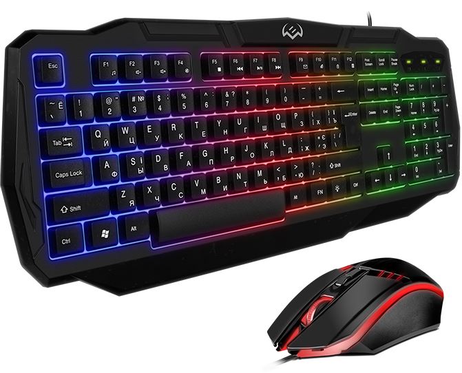 Геймерский набор (клавиатура+мышь), интерфейс USB, клавиатура -количество клавиш - 104 ,быстрого доступа - 12 шт, дышащий режим подсветки, длина кабеля -1,8 м; мышь - оптическая, проводная, количество кнопок - 3+1, изменяемое разрешение - 1000/1200/1600 dpi, динамическая подсветка корпуса.