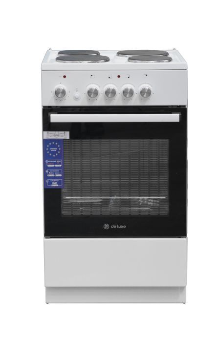 Размеры, мм - высота/ширина/глубина – 850/500/500 * Цвет - белый * 4 электрические конфорки 1,0/1,5/1,5/1,0 кВт * Объём духовки 43 л. * Большой противень * Малый противень * Решётка для жарки * Хозяйственный отсек *