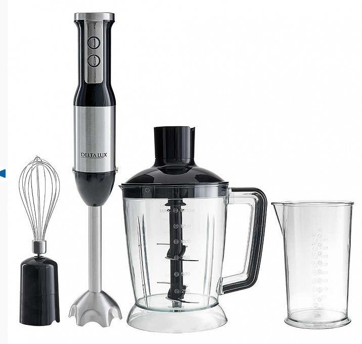 DELTA LUX DE-7003B черный Параметры Максимальная потребляемая мощность 1000 Вт Номинальная потребляемая мощность 600 Вт Объем чаши измельчителя 1500 мл Объем мерного стакана 500 мл Описание Блендер электрический предназначен для смешивания, измельчения и взбивания продуктов и жидкостей в бытовых условиях Идеально подходит для приготовления супов-пюре, соусов и подлив, детского питания, смешивания разнообразных коктейлей, измельчения продуктов в бытовых и аналогичных условиях, в частности: в кухонных зонах для персонала в магазинах, офисах и прочих производственных условиях; в фермерских домах; клиентами в гостиницах, мотелях и прочей инфраструктуре жилого типа; в условиях режима пансиона «проживание плюс завтрак» Цвет: черный Двойной нож из нержавеющей стали Три сменные насадки: насадка для измельчения и смешивания венчик для взбивания измельчитель Мерный стакан Индикатор сети с LED-подсветкой кнопок