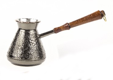 "Виноград" 0,6л. Медная турка классической конусообразной формы с утолщённым дном предназначена для приготовления ароматного натурального кофе. Внутренняя поверхность покрыта пищевым оловом. Наружная сторона украшена оригинальным орнаментом. Деревянная ручка является надёжным теплоизолирующим материалом. Подходит для всех типов плит, кроме индукционных. Проста в эксплуатации. Объём: 600 мл.