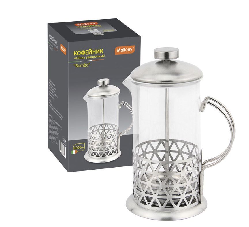 Кофе-пресс/чайник заварочный серия Rombo, объем 1000 мл, тм Mallony Предназначен для заваривания чая, кофе, прочих напитков. Коэффициент линейного расширения — 3,0. Корпус/фильтр/стержень из нержавеющей стали № 201, колба из жаропрочного боросиликатного стекла. Крышка — нерж сталь № 201/пластмасса. Толщина стекла — 0,8 мм Толщина нерж стали — 0,3 мм Можно мыть только стекл колбу в посудомоечной машине, остальные части не рекомендуется мыть в посудомоечной машине (можно мыть мягким моющим средством и теплой водой, хорошо просушивать). Упаковка: цветная картонная коробка.