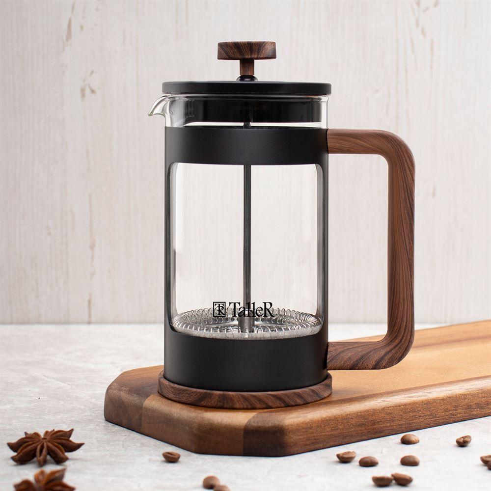 Френч-пресс Jennet из боросиликатного стекла 1000 мл/ крышка сталь • Термостойкое боросиликатное стекло, высококачественная нержавеющая сталь, пищевой пластик • Идеален для приготовления кофе, чая, тонизирующих и расслабляющих напитков • Удобная нен
