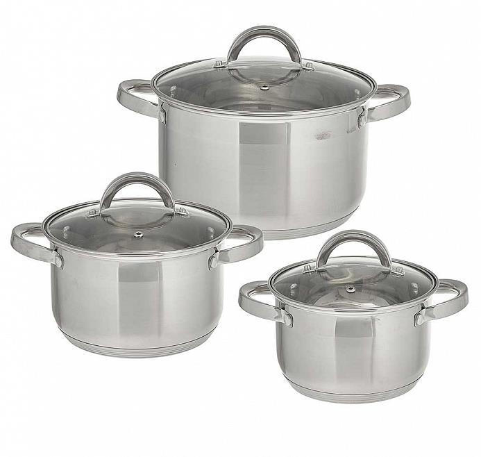 Параметры В наборе 6 предметов: кастрюля с крышкой 16х10,5см; 2,2л кастрюля с крышкой 18х11,5см; 3 л кастрюля с крышкой 22х13,5см; 5,2л Толщина стали 0,5 мм Описание Набор кастрюль из высококачественной нержавеющей стали со стеклянными крышками Серия: Standart Термосберегающее дно: пятислойное дно с повышенной термоотдачей Специальная форма, исключающая скопление остатков пищи и жира Обод, препятствующий переливанию жидкостей через край Быстрый нагрев пищи, длительное удержание тепла Минимальные потери минеральных веществ, витаминов и вкусовых качеств Подходит для использования на всех типах кухонных плит, включая индукционные Подходит для мытья в посудомоечной машине Упаковка: цветная коробка