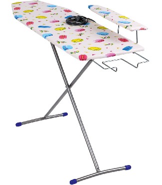 Гладильная поверхность -ДСП (1120х345мм), два положения высоты h-70, h-80см, выдвижная подставка под утюг, съемный подрукавник, электросоединитель 2,2 м, розетка, материал чехла-хлопок, max нагрузка на глад.поверхность 10кг