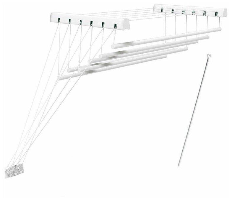 ЦВЕТ: белый. РАЗМЕР ИЗДЕЛИЯ: 430 x 1 800 x 1 350 мм. МАТЕРИАЛ: металл + полипропилен. Представляет из себя конструкцию из крепежных кронштейнов, штанг-трубок, на которых развешивается бельё, и веревочной системы для фиксирования штанг на двух разных положениях: на высоте комфортной для развешивания белья и на высоте для сушки белья. Суммарная длина поверхности для размещения белья - 10,8м. Максимальная нагрузка - 12кг.