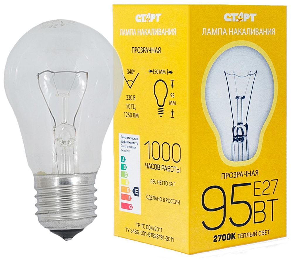 Лампа накаливания. Индивидуальная упаковка из картона. Колба — груша прозрачная. Мощность 95 Вт. Цоколь Е27.