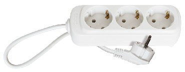 Трёхжильный кабель ПВС, сечение 0,75 мм2, вилка евро двухполюсная с двойным заземляющим контактом, номинальное напряжение: 220 В, рабочая частота: 50-60 Гц, сила тока: 10 А, макс. мощность нагрузки: 2200 W (2,2 кВт), 3 гнезда, длина кабеля: 3 м, материал: пластик, индивидуальная упаковка: пакет с еврослотом.