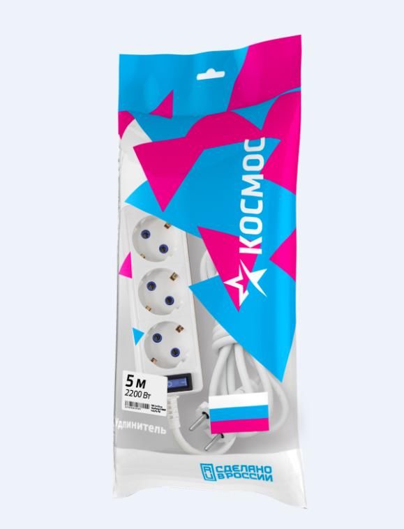Удлинитель КОСМОС 10А 3 гн ПВС 3*0,75 (5м) 1300Вт с заземл и кнопкой Россия