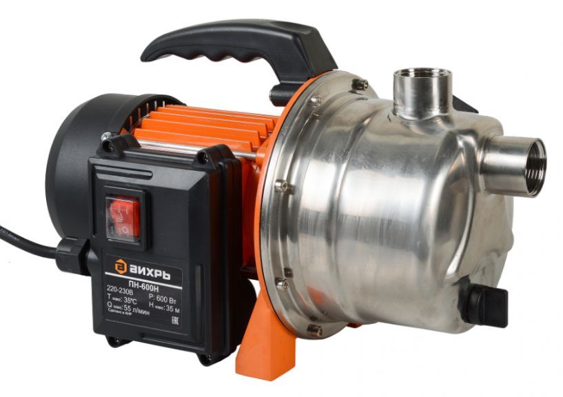 Поверхностный насос ВИХРЬ ПН-600Н. Мощность, Вт – 600; Тип насоса – центробежный; Максимальный напор, м - 35; Максимальная подача, л/мин – 55; Материал корпуса насоса – нерж. сталь;
