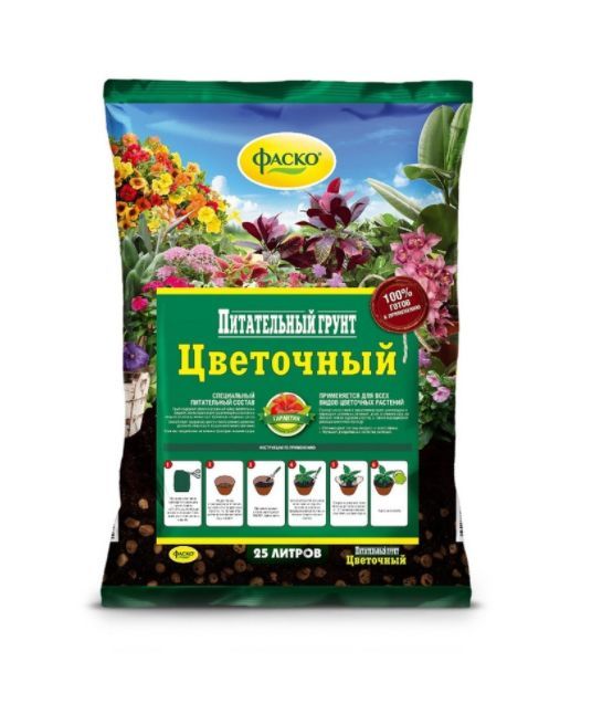 ФАСКО Грунт для цветов Цветочный 25л Идеальное соотношение питательных веществ в легкодоступной форме Способствует развитию корневой системы Не содержит патогенной микрофлоры Не содержит жизнеспособных семян сорняков Эффективность подтверждена тестами Рекомендуется профессиональными цветоводами Описание Грунт для цветов Фаско Цветочный является экологически чистым и питательным грунтом, который полностью готов к эксплуатации. Основа состоит из качественного торфа с добавлением всех необходимых минеральных удобрений. Благодаря пропорциональному и особому составу, данный грунт способен обеспечить здоровый и активный рост растениям, стимулировать прорастание семян, а также повысит их устойчивость к болезням! Рекомендации по применению Для выращивания и пересадки цветов, а также для посадки луковичных растений в открытый грунт. Состав Верховой торф, низинный торф, песок, известняковая (доломитовая) мука, комплексное минеральное удобрение с микроэлементами.